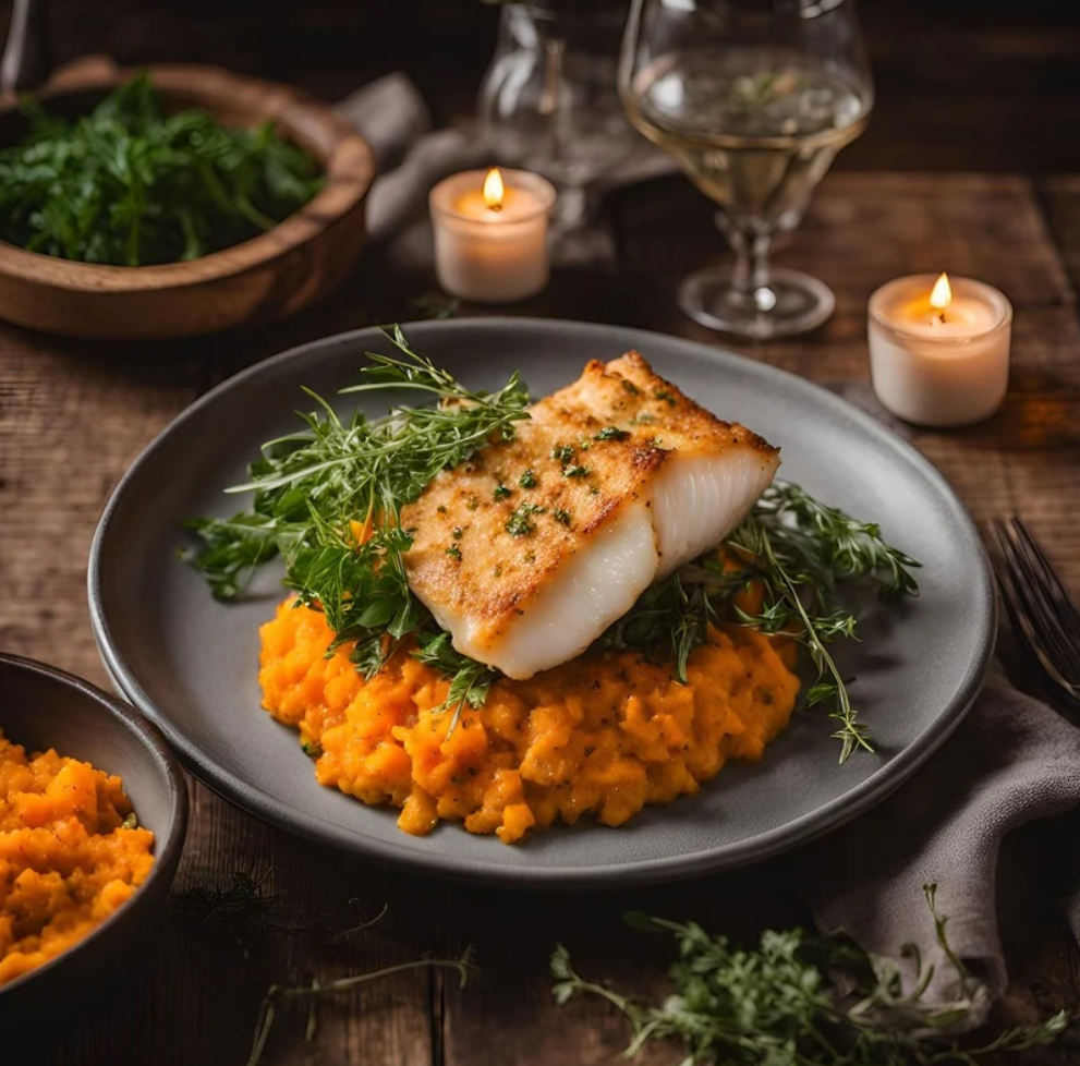 Poisson vapeur, purée de patates douces et carottes vapeur avec des graines de courge