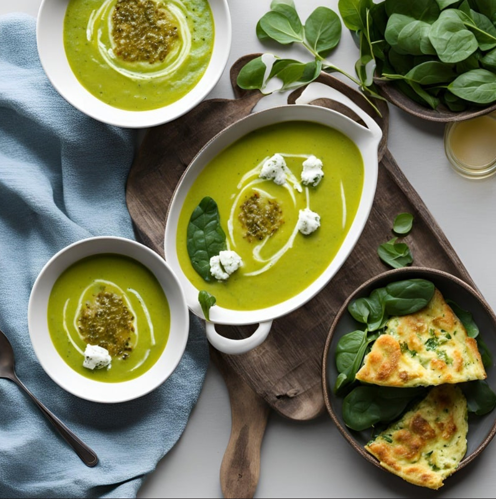 Velouté de courgettes au lait de coco, omelette aux épinards et au chèvre